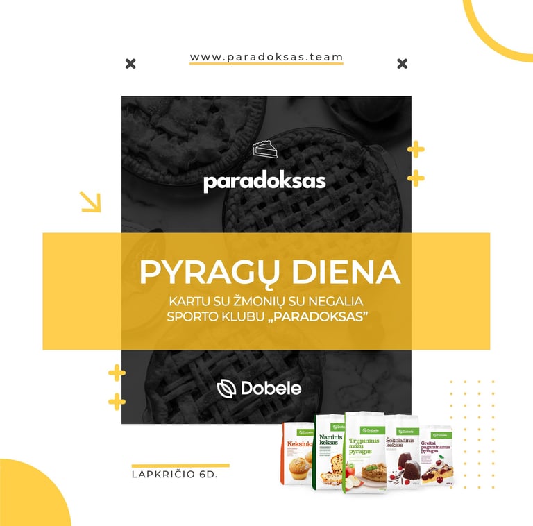 Šią dieną žmonių su negalia sporto klubas „Paradoksas“ kartu su savo bičiuliais „Dobele“ kviečia visus švęsti Pyragų dieną savo darbo kolektyvuose, bendruomenėse ar verslo centruose – kepant, dalijantis ir kartu prisidedant prie mūsų sporto komandos palaikymo bei bendrystės misijos.